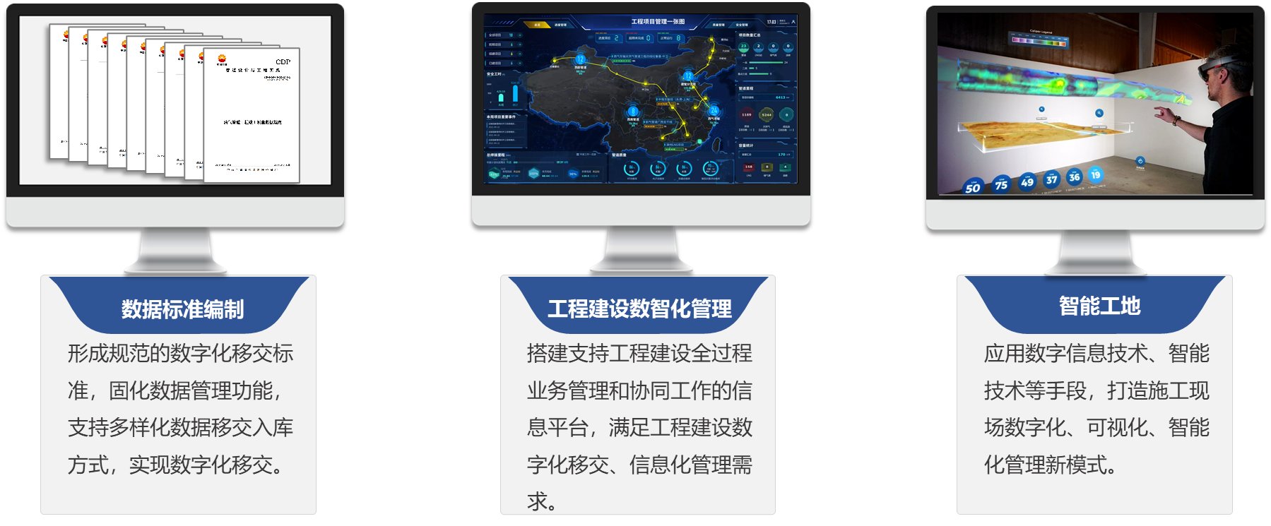 “智能建造”业务主要服务于能源储运工程项目建设期的精细化管理。通过在现场快速部署标准化、智能化的数据感知和管控设备,在后端构建数据处理、决策分析的管理平台,融合地理信息、三维建模等技术,实现数据自动感知、现场远程可视、管理智能可控,满足施工现场精准管控和建设数字孪生体需要。